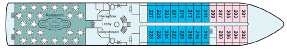 Launch year | Language | Length | Width | Currency | Speed | Capacity | Crew count | Deck count | Cabin count | Large cabin count | Wheelchair cabin count | Electrical plugs |