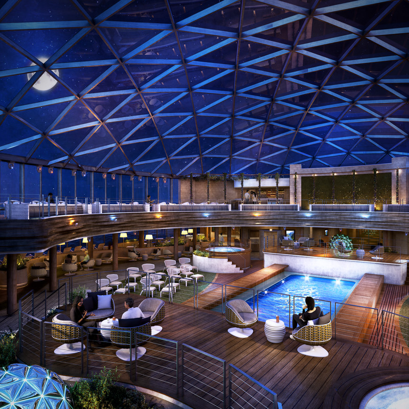 The two-deck SkyDome, on decks 16 and 17, will include a swimming pool that transforms into a stage at night, as well as a glass dome roof, designed by British engineers Eckersley O’Callaghan.