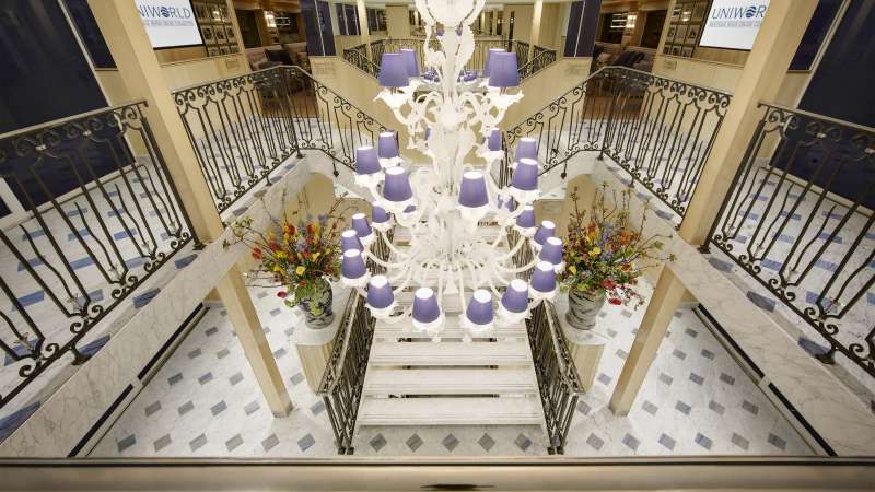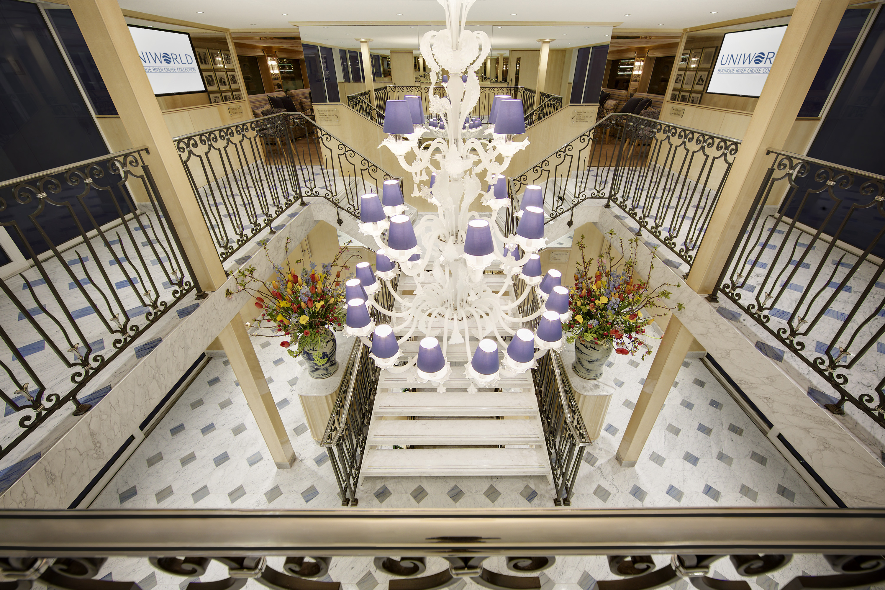 The S.S. Beatrice boasts yacht-style light wood with blue and white finishes throughout. Its renovated lobby features elegant mirrors, marble floors, a white Murano chandelier with blue shades, and a grand staircase made of nickel and black iron – a signature design element of Uniworld’s Super Ships.